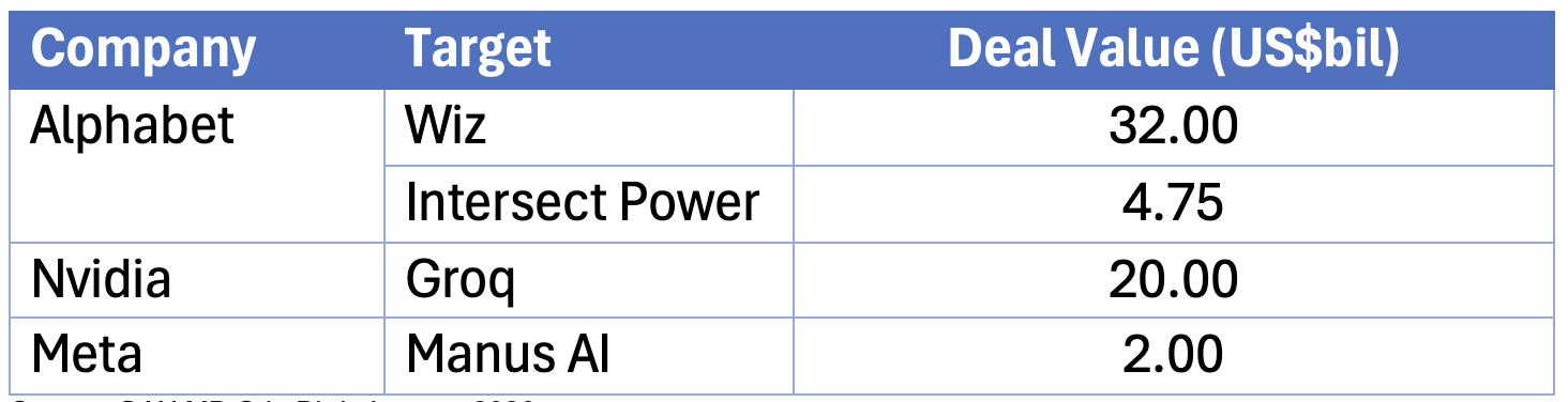 Alphabet’s acquisitions of Wiz for US$32 billion and Intersect Power for US$4.75 billion have significantly strengthened its cloud security and AI data center ecosystem. Similarly, Meta is reportedly set to acquire Singapore based Manus AI at a valuation exceeding US$2 billion, following its US$14.8 billion investment in Scale AI earlier in the year. Nvidia also joined this trend with a US$20 billion deal to license assets from AI chip startup Groq and absorb its team, including the cofounder and CEO.