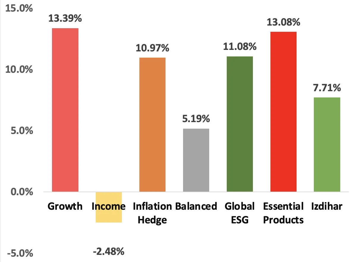 Note: Past performance is not an indication of future performanceBalanced allocation consists of 30% Growth, 47% Income and 23% Inflation HedgeThe Izdihar portfolio YTD performance is calculated from July 17, 2025, aligning with its official launch date.