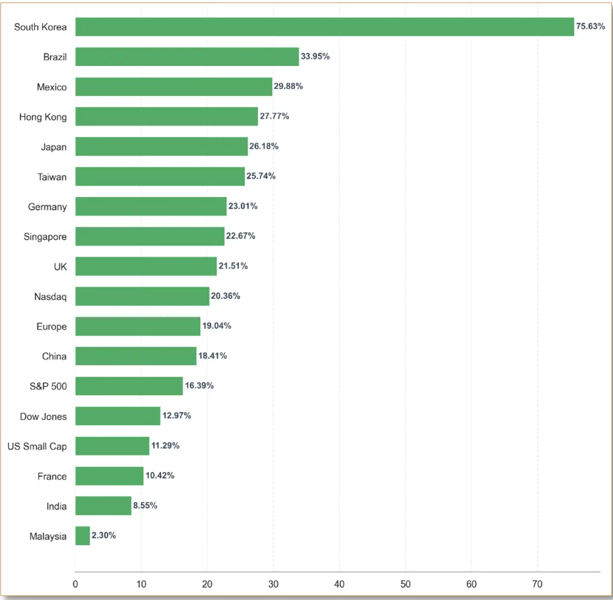 However, the standout story of 2025 was that the US was not the top dog. South Korea emerged as the strongest market globally, surging by 75.63%. Brazil, Mexico, and Hong Kong also outperformed US equities in 2025. On the other end of the spectrum, only a handful of markets trailed behind the US. Unfortunately, Malaysia was among them. The FBM KLCI saw a return of just 2.30% in 2025, making it the weakest market on our radar.