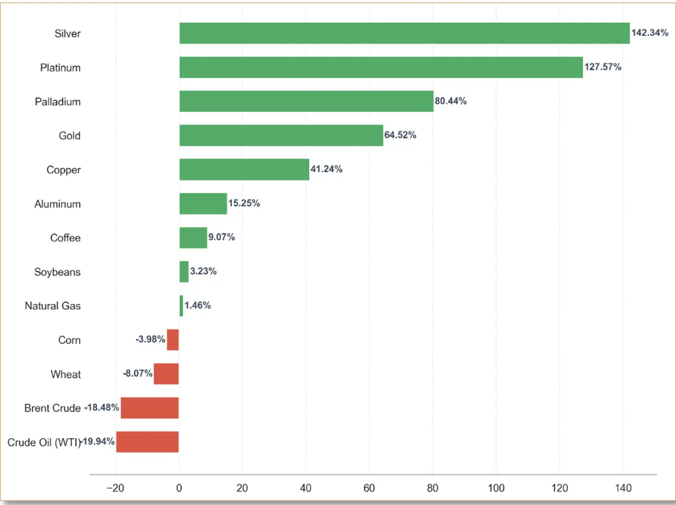 Commodities delivered one of their strongest annual performances. Metals drove the vast majority of these gains, claiming all top six spots for best performing commodities in 2025. Silver and platinum led the charge with exceptional returns of 143.34% and 127.57% respectively.