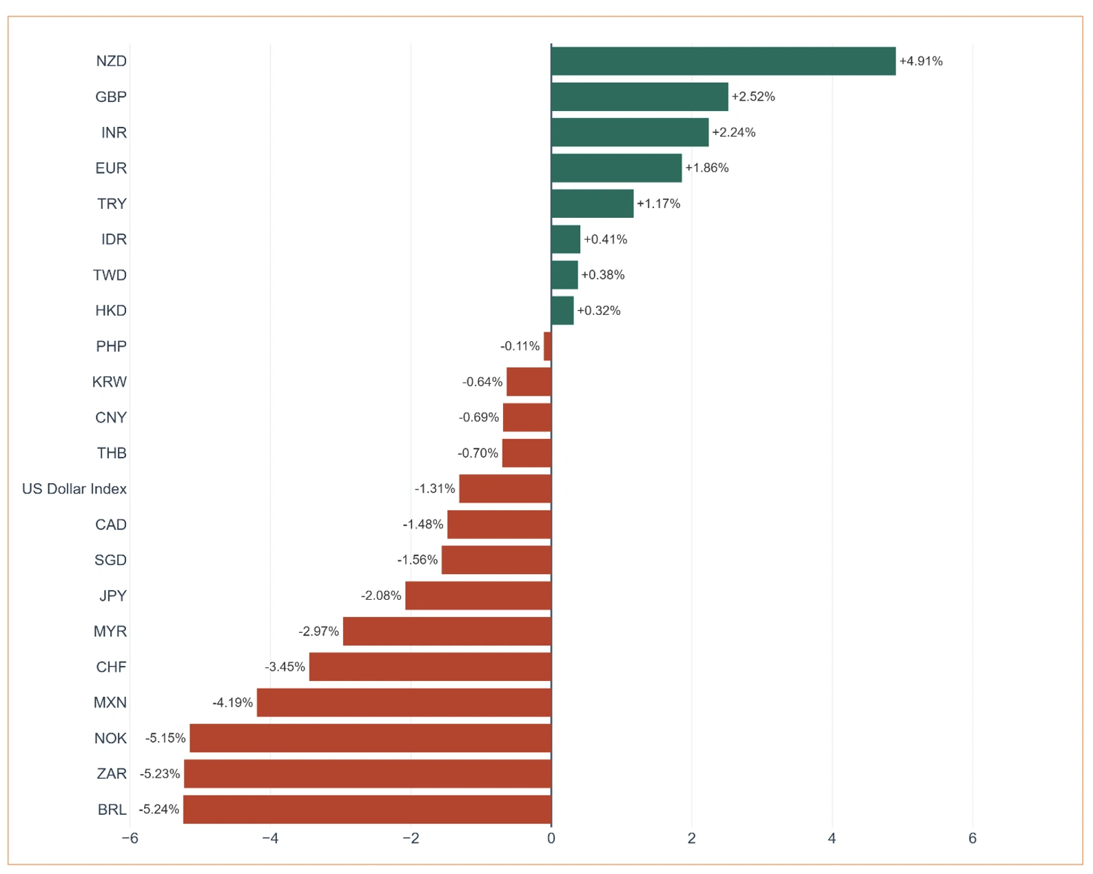 Importantly, several emerging-market currencies strengthened even more than the Ringgit. TheSouth African Rand, Brazilian Real, and Mexican Peso all posted strong gains.Exposure to markets with strengthening currencies amplified local assetreturns, resulting in higher portfolio values in both USD and MYR terms.