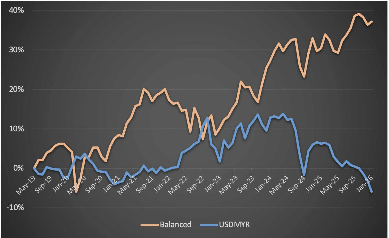 The current USDollar down cycle began in April 2024. From the end of April 2024 to the end of January 2026, it fell by 17.4%, as illustrated in Chart 6. Despite this sizeable translation loss, the balanced portfolio still produced gains when measured in Ringgit.