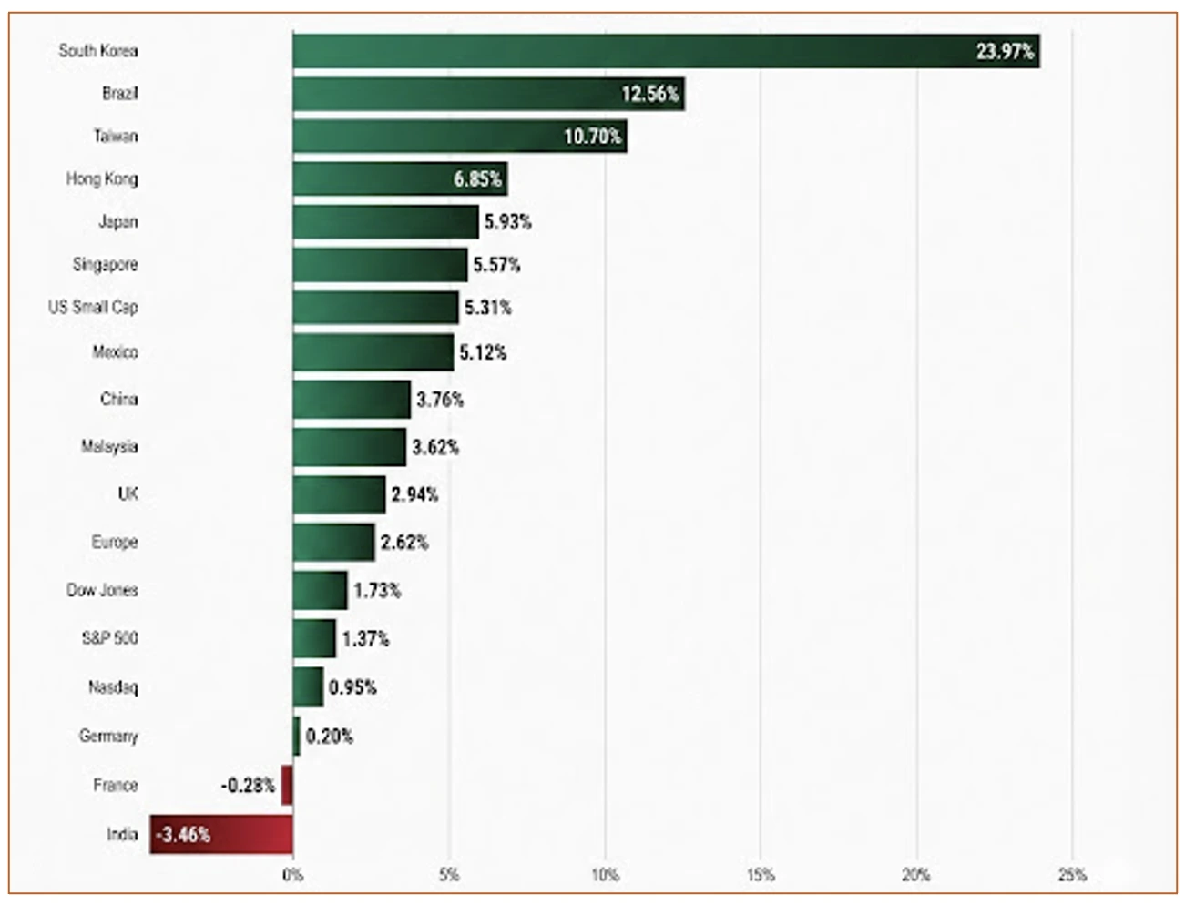 The US market returns were decent, but modest when compared to the explosive rallies seen elsewhere. South Korea,Brazil, and Taiwan posted double-digit gains. Among the markets we monitor, the US outperformed only Germany, France, and India.