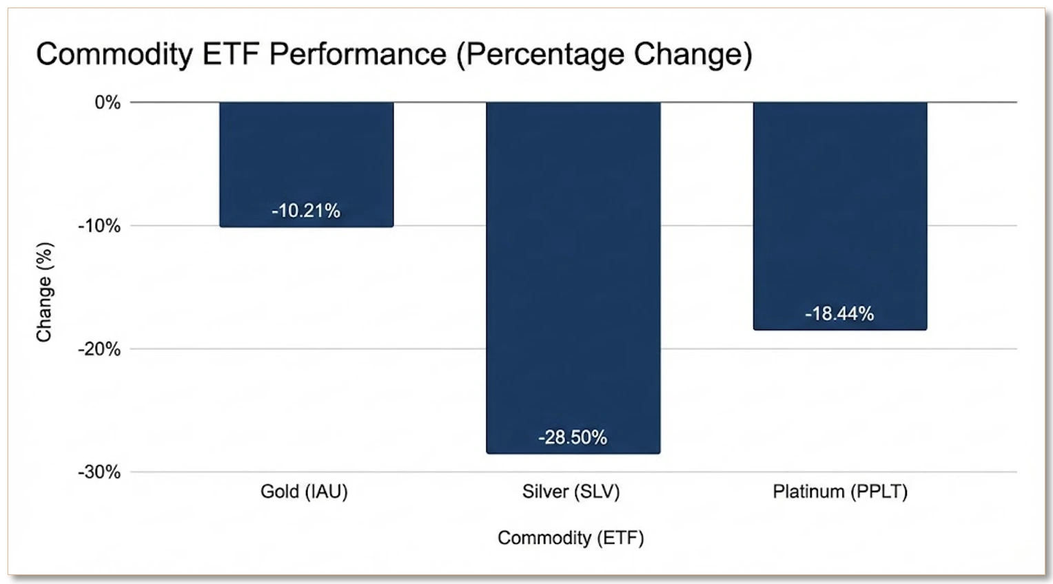 After a volatile January, the market buckled right at the beginning of February with a sharp correction in the precious metals sector a move that captured headlines globally. Gold (IAU) fell 10.21%, silver (SLV) dropped 28.50%, and platinum (PPLT) declined 18.44%.