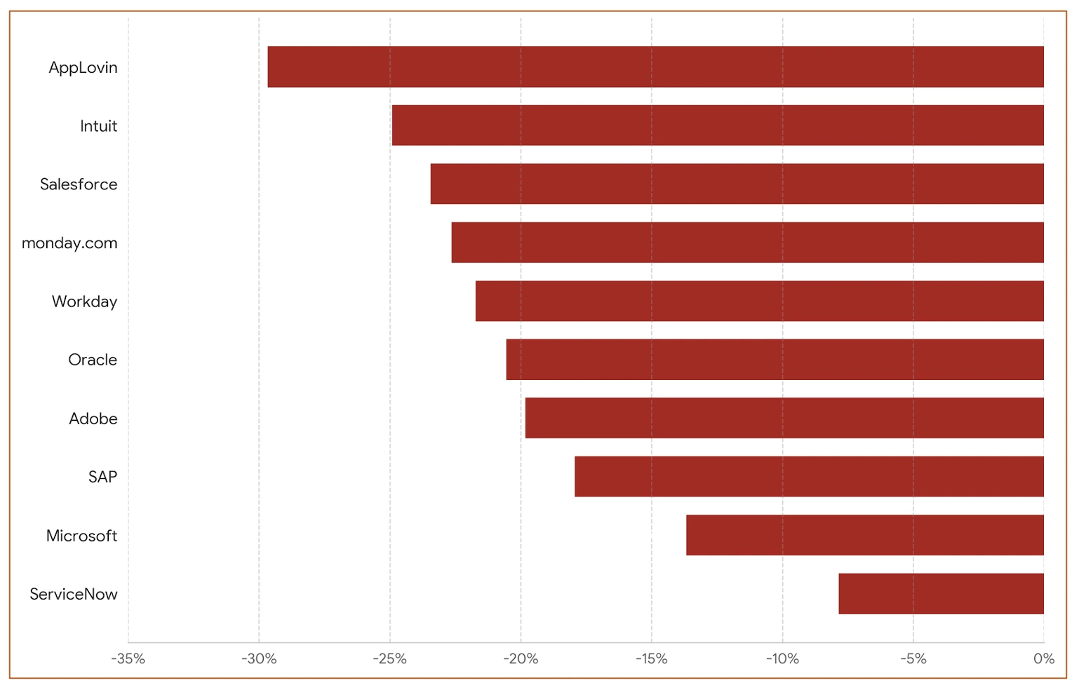 January was punishing for the giants of the software world. Heavyweights like Microsoft, Adobe, and Salesforce fell between 10% and 30%.